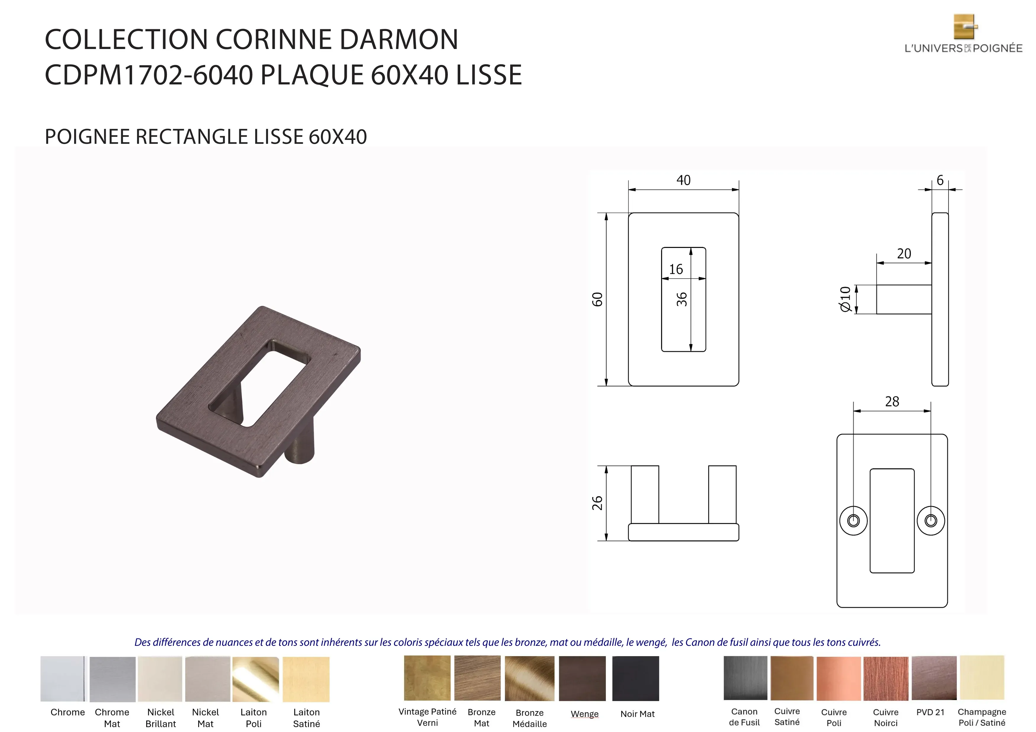 Laiton satiné ; Laiton poli ; Chrome mat ; Chrome brillant ; Nickel mat ; Nickel brillant ; Bronze mat ; Bronze médaille ; Bronze vintage ; Wengé ; Blanc ; Noir mat ; Canon de fusil ; Cuivre satiné ; Cuivre brillant ; Cuivre noirci ; Champagne mat ; Champagne brillant
