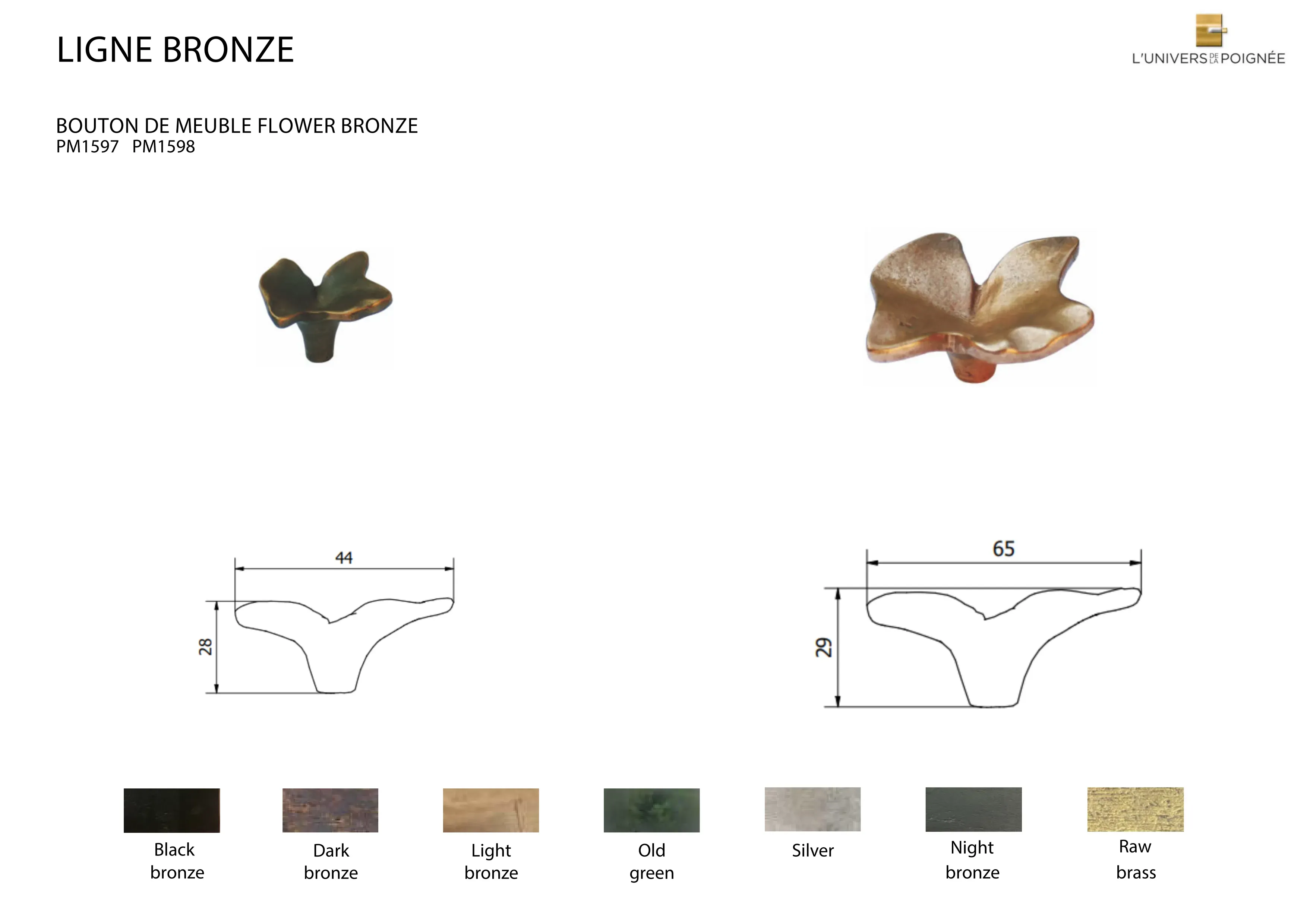 Les finitions disponibles incluent : Black bronze ; Dark Bronze ; Light Bronze ; Old Green ; Silver ; Night Bronze ; Old Brass ; Nickel Brillant
