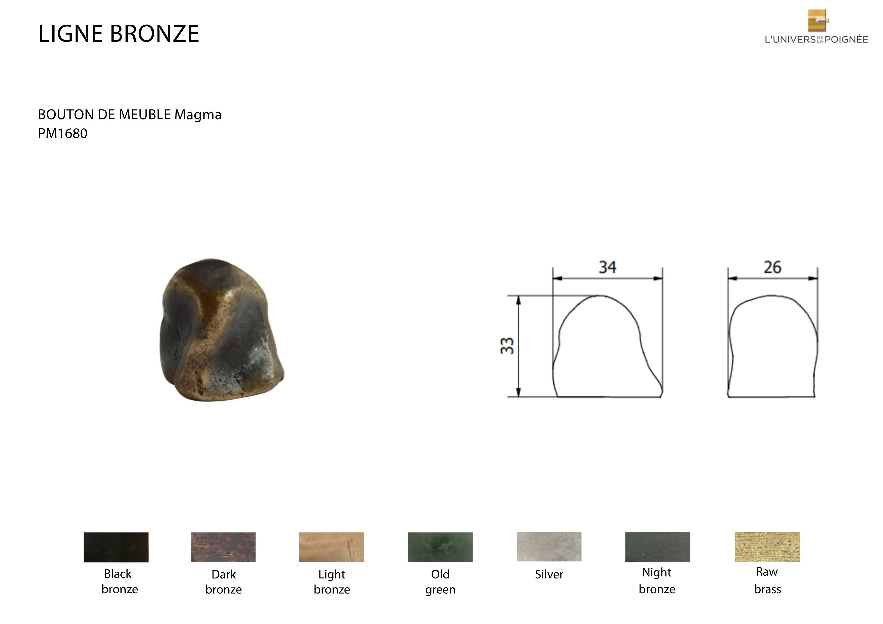 Le bouton de meuble Magma est un modèle en bronze, dont la forme organique semble avoir été façonnée directement par la main de l’artisan. Sa conception issue de moules au sable lui confère une texture unique, avec des aspérités naturelles qui apportent un caractère authentique et singulier à chaque pièce.