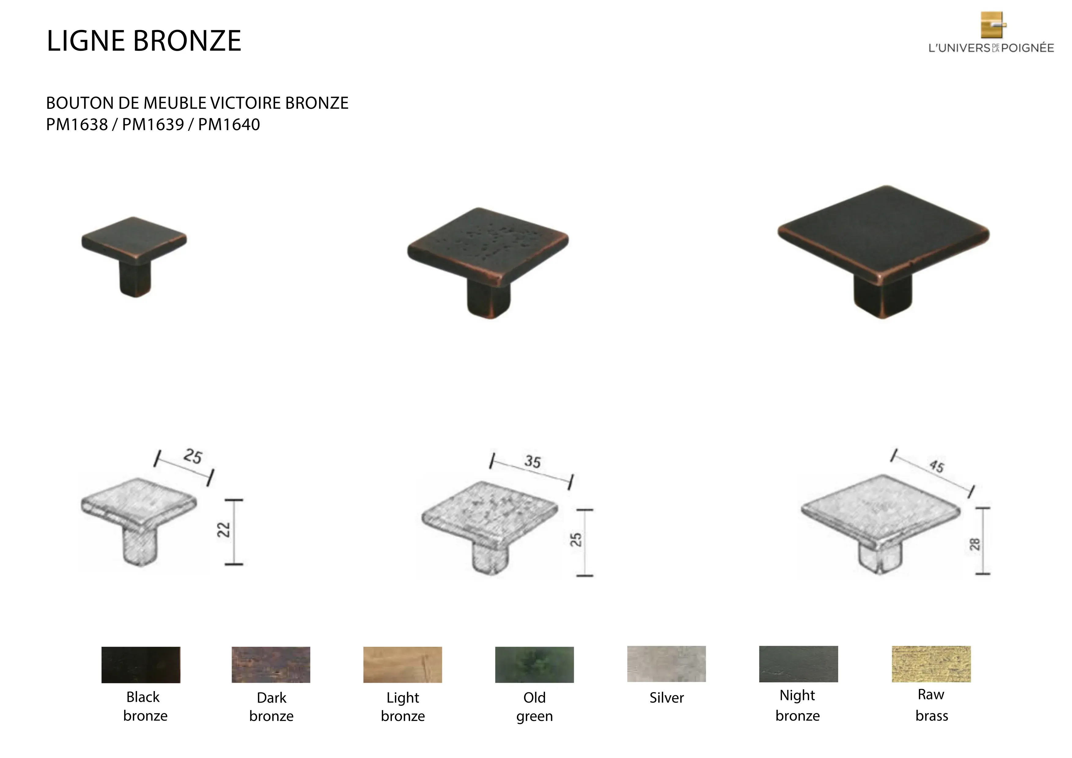 Les finitions disponibles incluent : Black bronze ; Dark Bronze ; Light Bronze ; Old Green ; Silver ; Night Bronze ; Old Brass ; Nickel Brillant