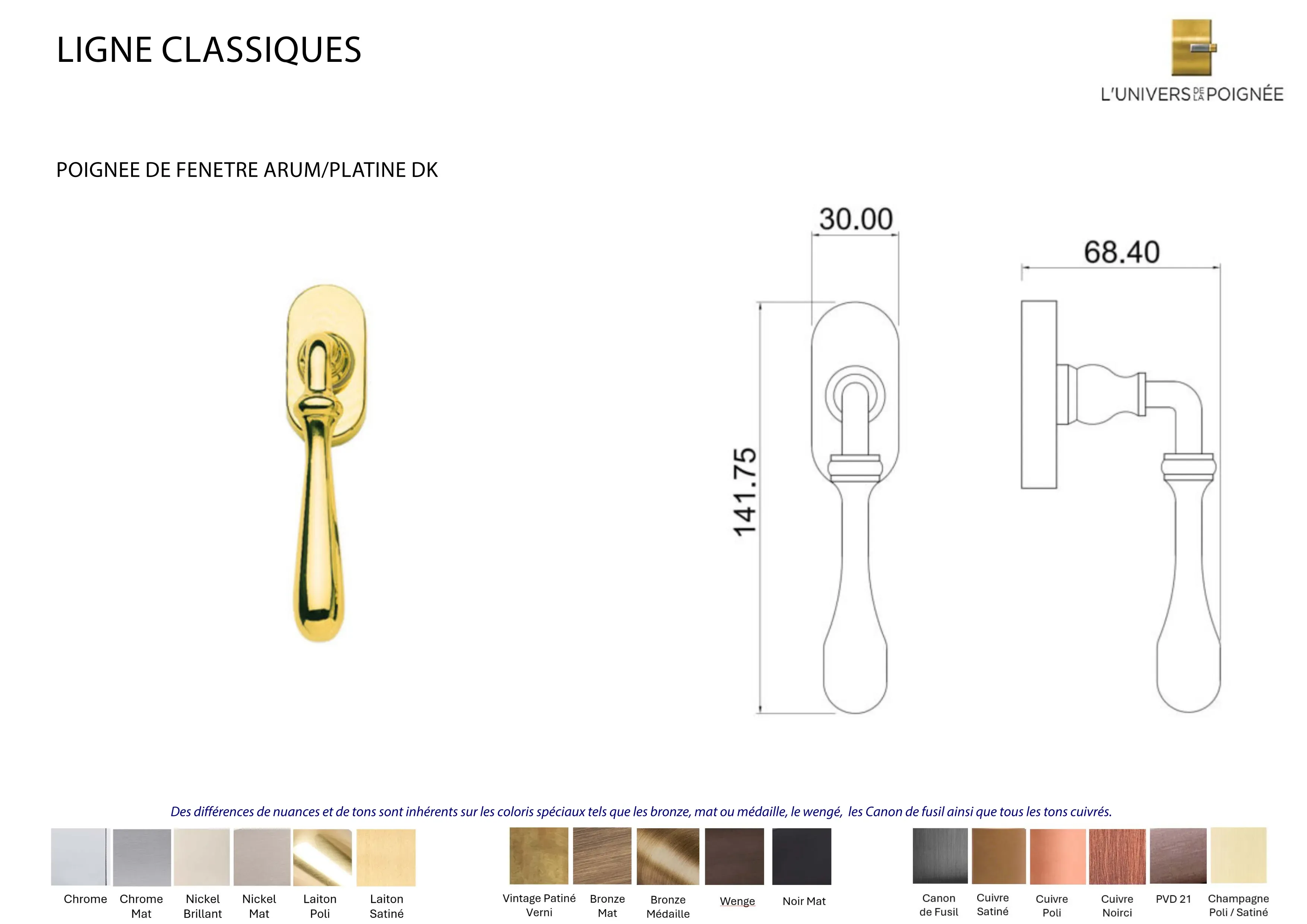 Parce que chaque intérieur mérite une finition sur mesure, la poignée de fenêtre Arum est disponible en plus de 15 coloris différents, parmi lesquels : Laiton satiné ; Laiton poli ; Chrome mat ; Chrome brillant ; Nickel mat ; Nickel brillant ; Bronze mat ; Bronze médaille ; Bronze vintage ; Wengé ; Blanc ; Noir mat ; Canon de fusil ; Cuivre satiné ; Cuivre brillant ; Cuivre noirci ; Champagne mat ; Champagne brillant