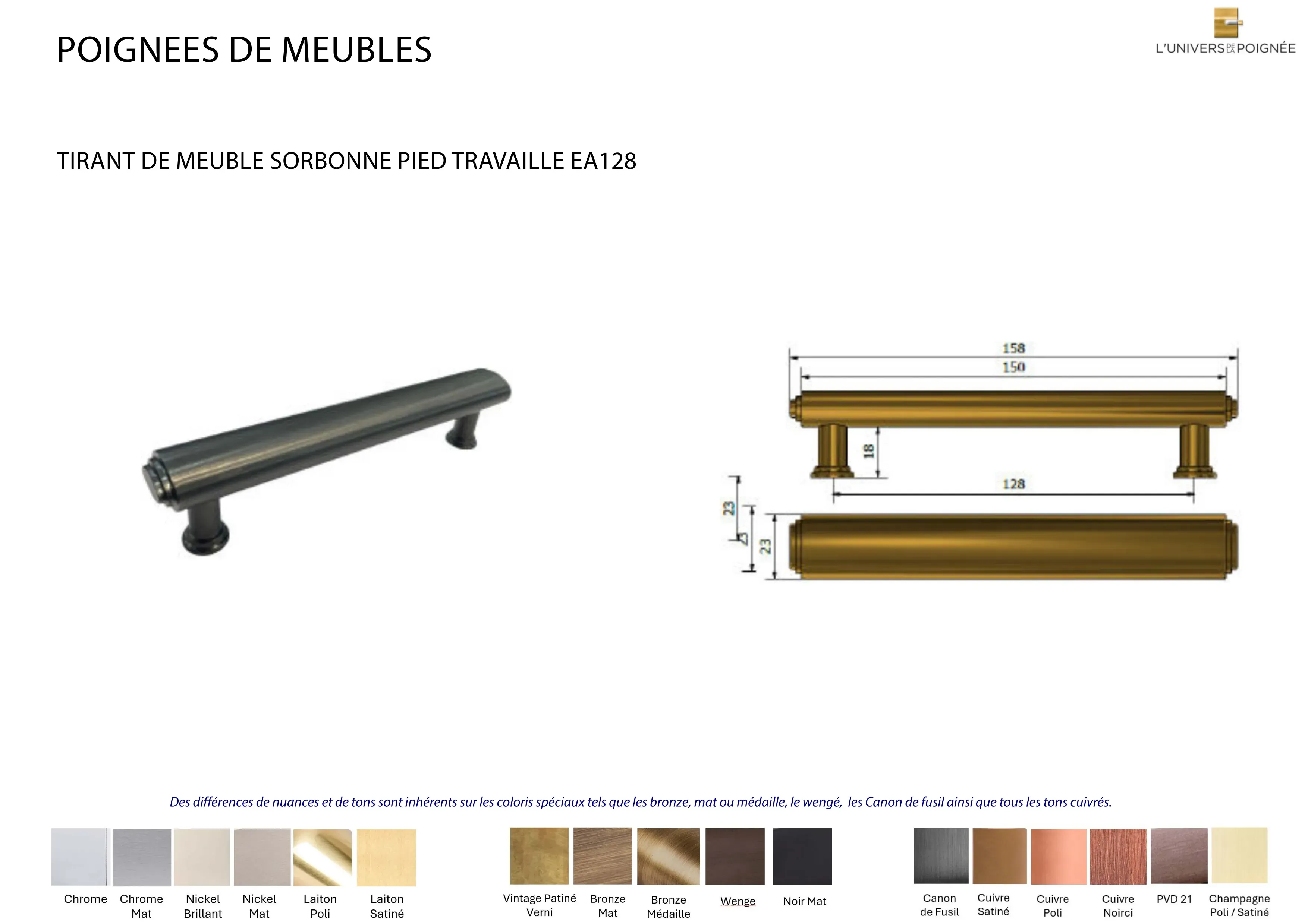 Parce que chaque intérieur mérite une finition sur mesure, le tirant est disponible en plus de 15 coloris différents, parmi lesquels : Laiton satiné ; Laiton poli ; Chrome mat ; Chrome brillant ; Nickel mat ; Nickel brillant ; Bronze mat ; Bronze médaille ; Bronze vintage ; Wengé ; Blanc ; Noir mat ; Canon de fusil ; Cuivre satiné ; Cuivre brillant ; Cuivre noirci ; Champagne mat ; Champagne brillant