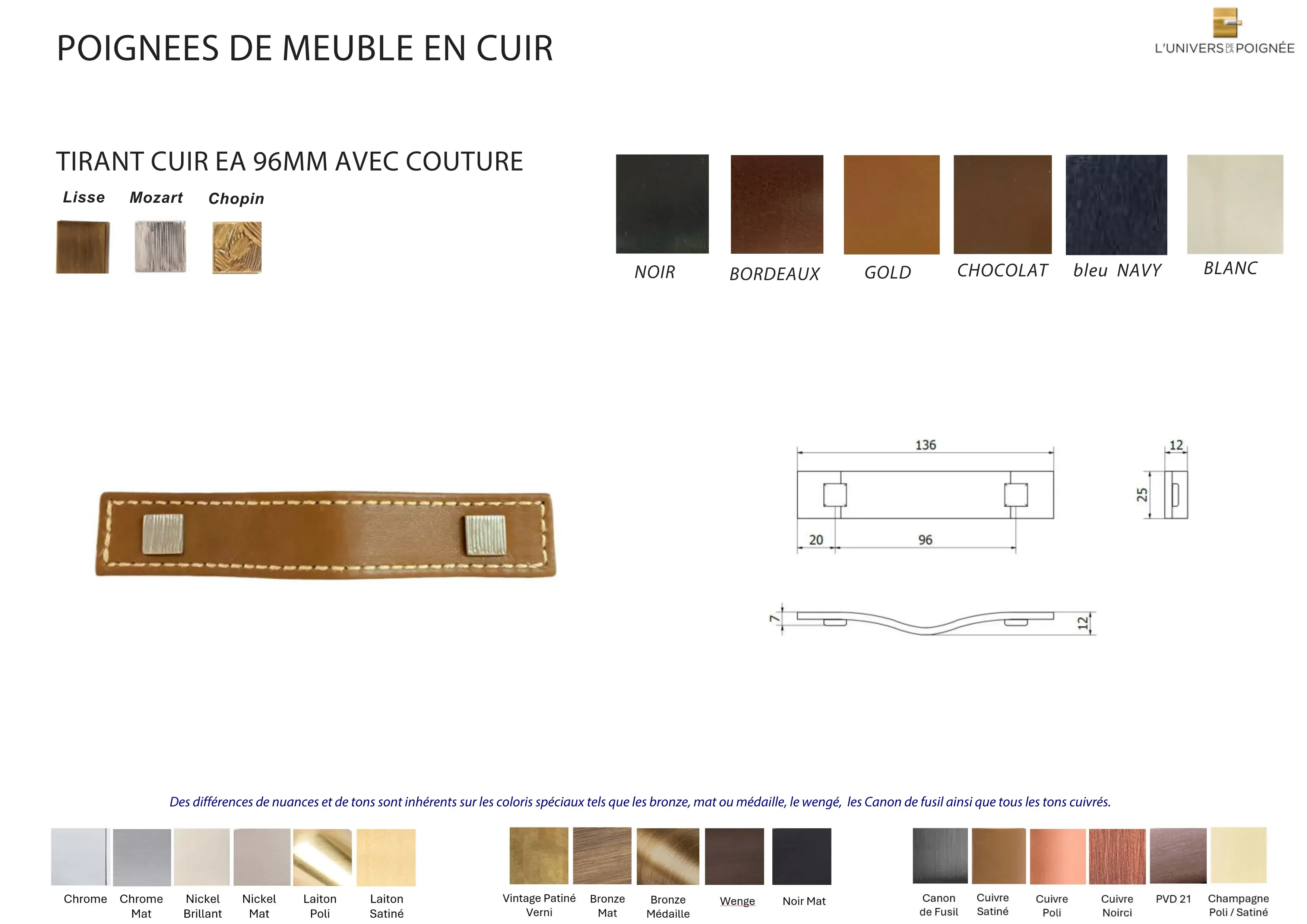 Cette collection de tirants de meuble en cuir se distingue par son design épuré et naturel. Disponible en cuir lisse ou surpiqué, elle offre un choix de différents coloris : noir, bordeaux, gold, bleu navy, chocolat et blanc, permettant de s’adapter à diverses ambiances et styles d’intérieur.