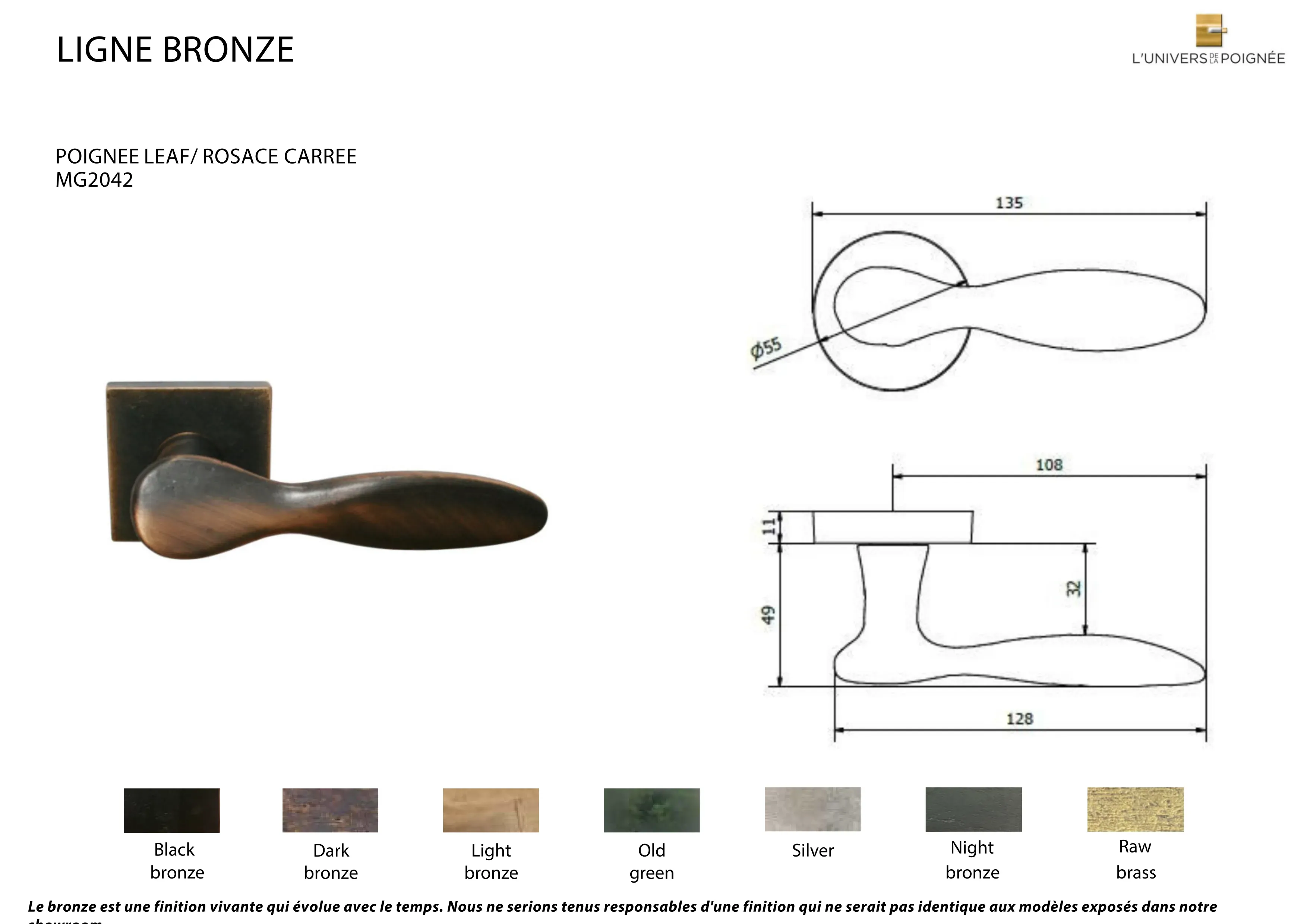 Les finitions disponibles incluent : Black bronze ; Dark Bronze ; Light Bronze ; Old Green ; Silver ; Night Bronze ; Old Brass ; Nickel Brillant