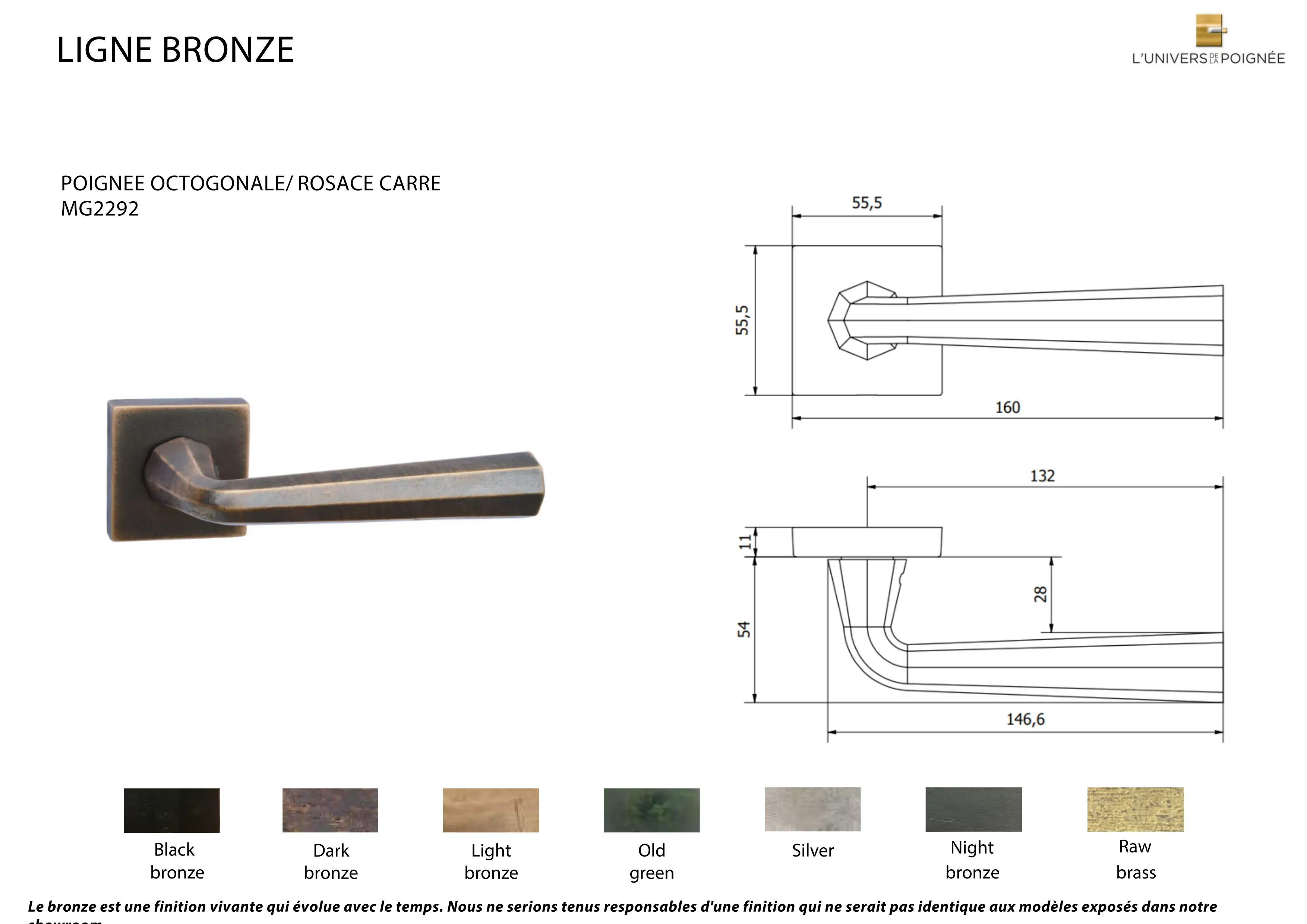 Les finitions disponibles incluent : Black bronze ; Dark Bronze ; Light Bronze ; Old Green ; Silver ; Night Bronze ; Old Brass ; Nickel Brillant