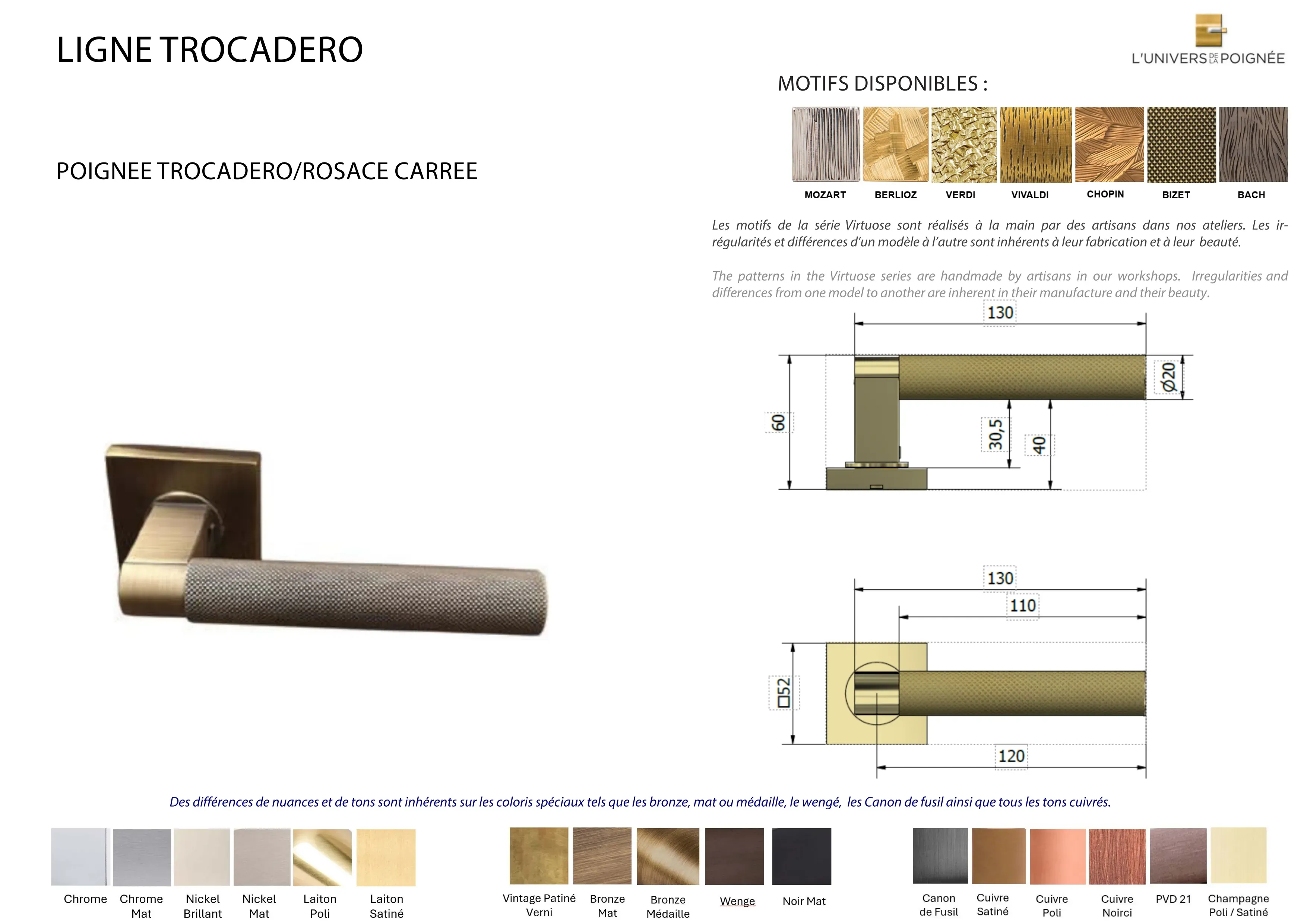 Parce que chaque intérieur mérite une finition sur mesure, la poignée de porte Trocadéro est disponible en plus de 15 coloris différents, parmi lesquels : Laiton satiné ; Laiton poli ; Chrome mat ; Chrome brillant ; Nickel mat ; Nickel brillant ; Bronze mat ; Bronze médaille ; Bronze vintage ; Wengé ; Blanc ; Noir mat ; Canon de fusil ; Cuivre satiné ; Cuivre brillant ; Cuivre noirci ; Champagne mat ; Champagne brillant