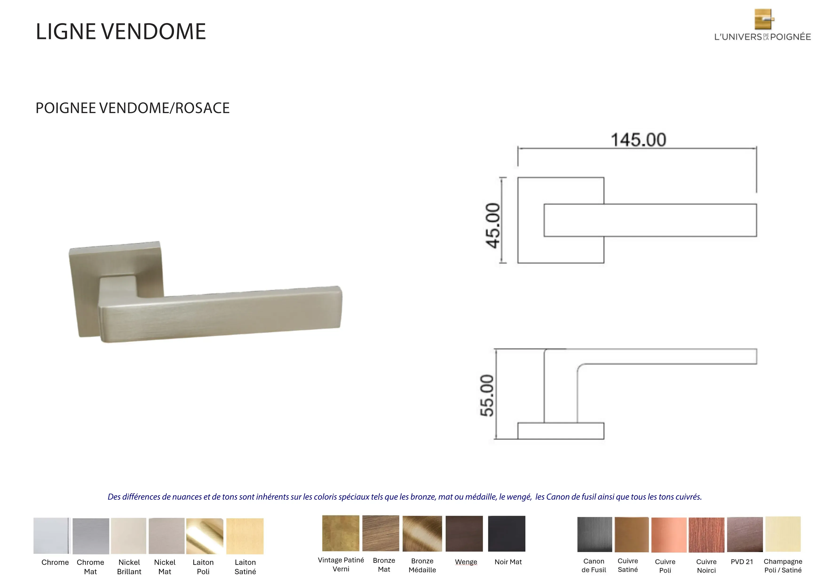 Parce que chaque intérieur mérite une finition sur mesure, la poignée de porte Vendôme est disponible en plus de 15 coloris différents, parmi lesquels : Laiton satiné ; Laiton poli ; Chrome mat ; Chrome brillant ; Nickel mat ; Nickel brillant ; Bronze mat ; Bronze médaille ; Bronze vintage ; Wengé ; Blanc ; Noir mat ; Canon de fusil ; Cuivre satiné ; Cuivre brillant ; Cuivre noirci ; Champagne mat ; Champagne brillant