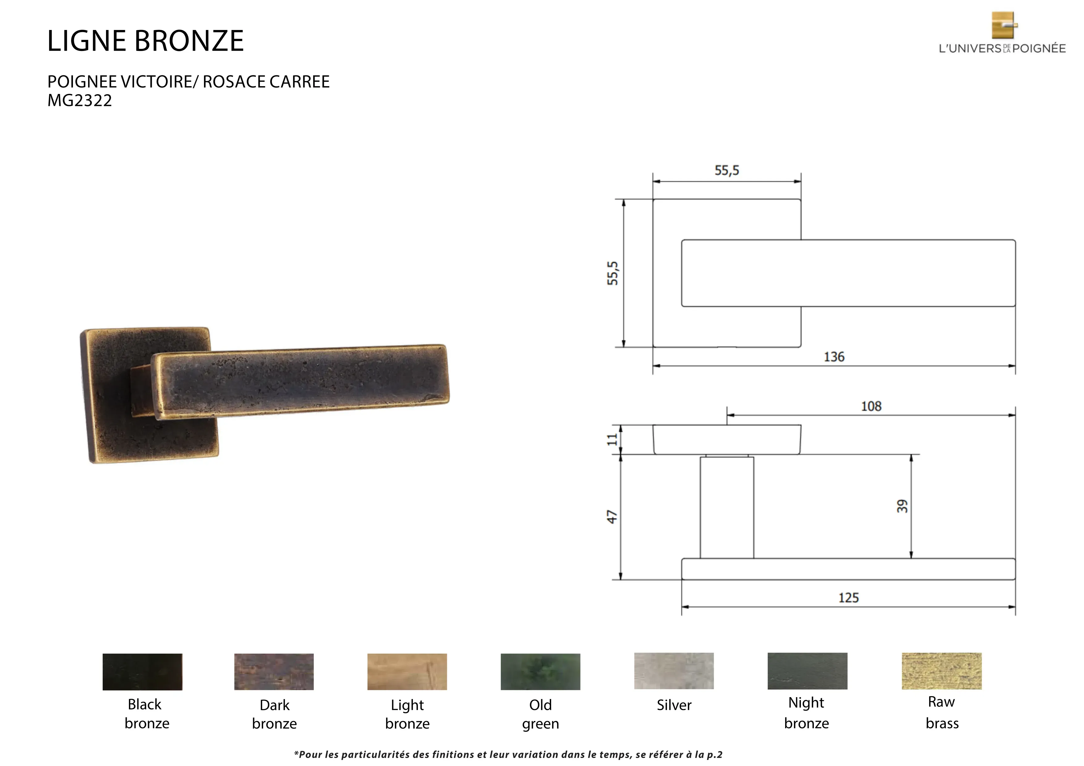 Les finitions disponibles incluent : Black bronze ; Dark Bronze ; Light Bronze ; Old Green ; Silver ; Night Bronze ; Old Brass ; Nickel Brillant