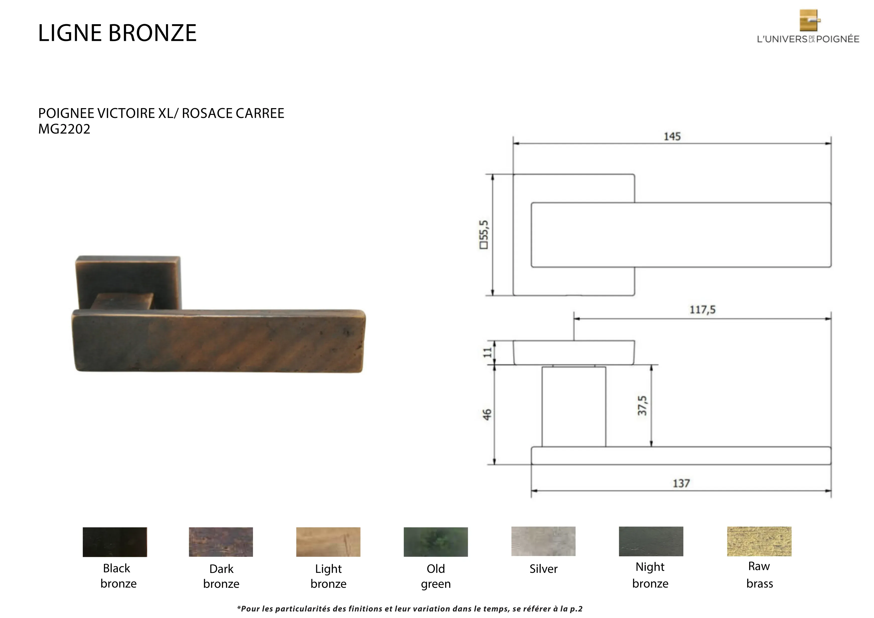 Les finitions disponibles incluent : Black bronze ; Dark Bronze ; Light Bronze ; Old Green ; Silver ; Night Bronze ; Old Brass ; Nickel Brillant