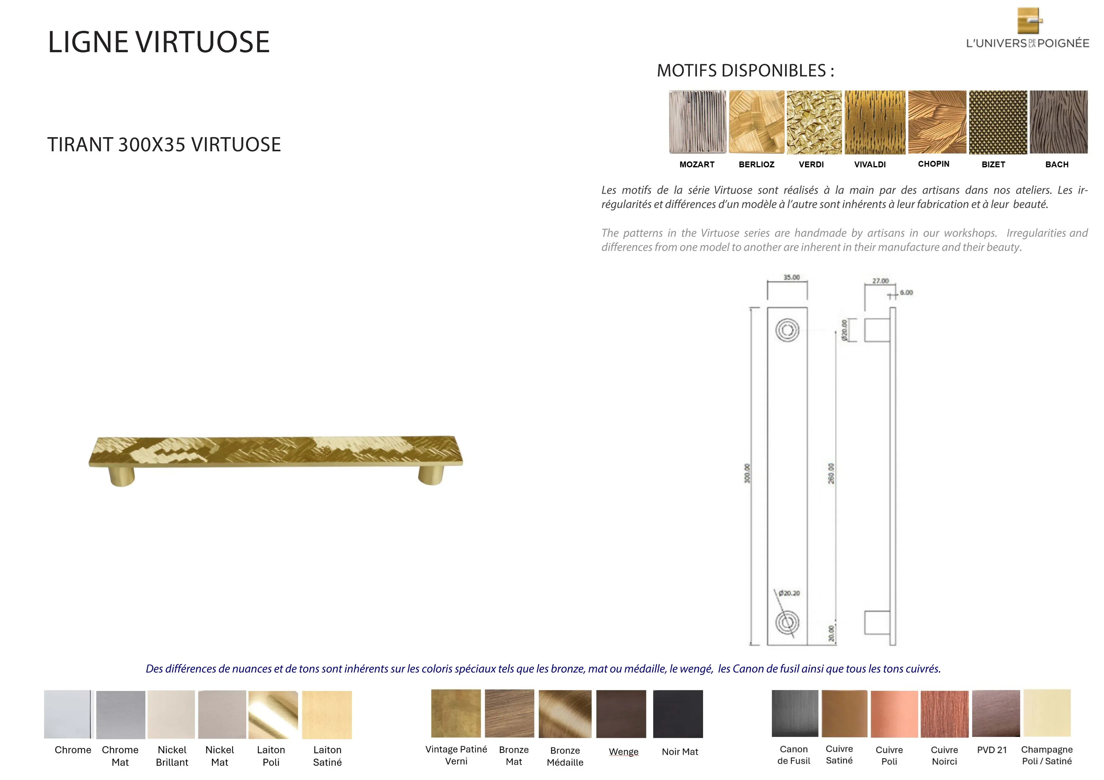 Parce que chaque intérieur mérite une finition sur mesure, cette plaque de tirage est disponible en plus de 15 coloris différents, parmi lesquels : Laiton satiné ; Laiton poli ; Chrome mat ; Chrome brillant ; Nickel mat ; Nickel brillant ; Bronze mat ; Bronze médaille ; Bronze vintage ; Wengé ; Blanc ; Noir mat ; Canon de fusil ; Cuivre satiné ; Cuivre brillant ; Cuivre noirci ; Champagne mat ; Champagne brillant