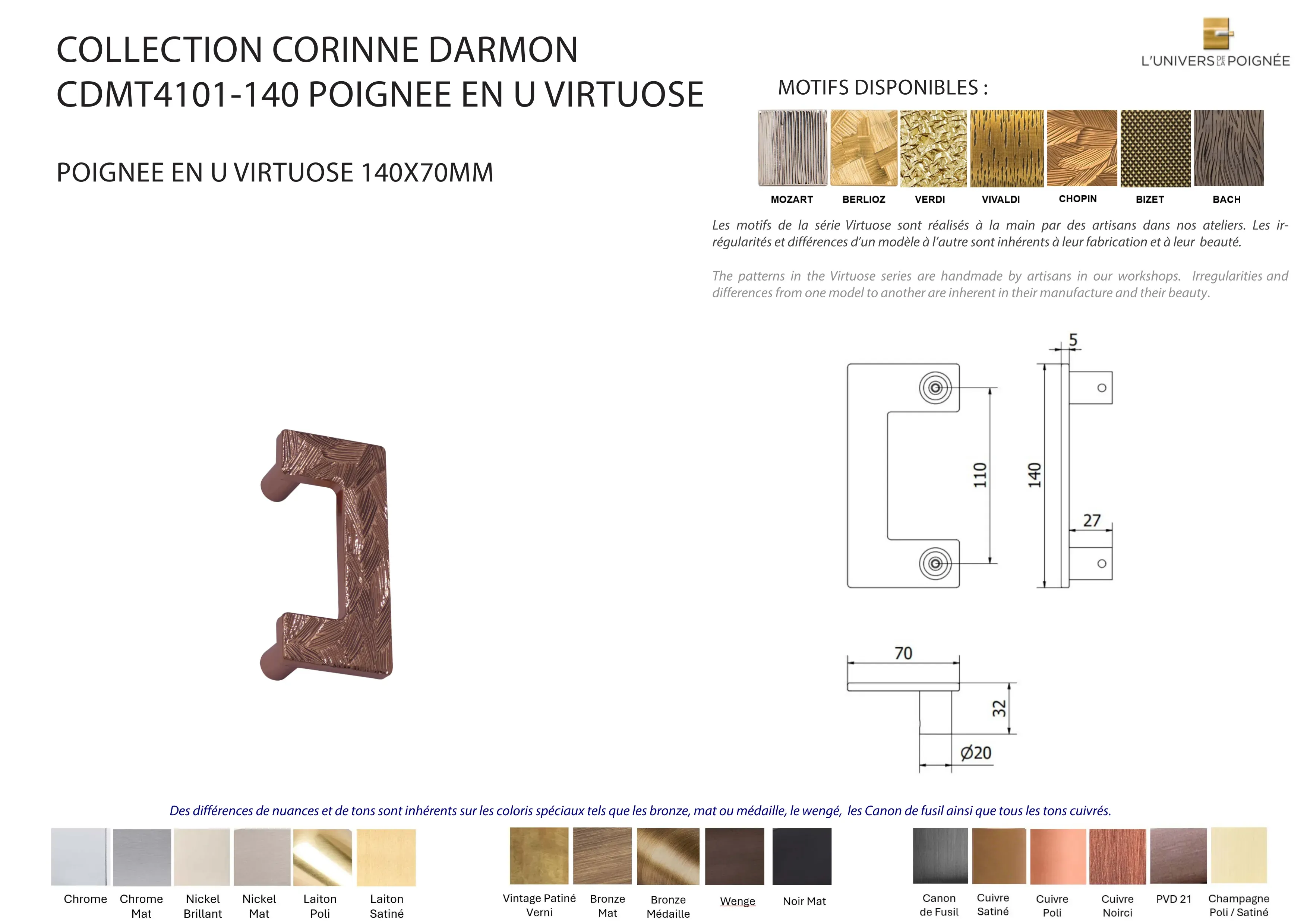 Parce que chaque détail compte, la poignée en U 140x70mm peut être entièrement personnalisée grâce à un travail artisanal minutieux de gravure. Son design peut être sublimé par des motifs exclusifs de la collection Virtuose renforçant encore son allure décorative et raffinée.