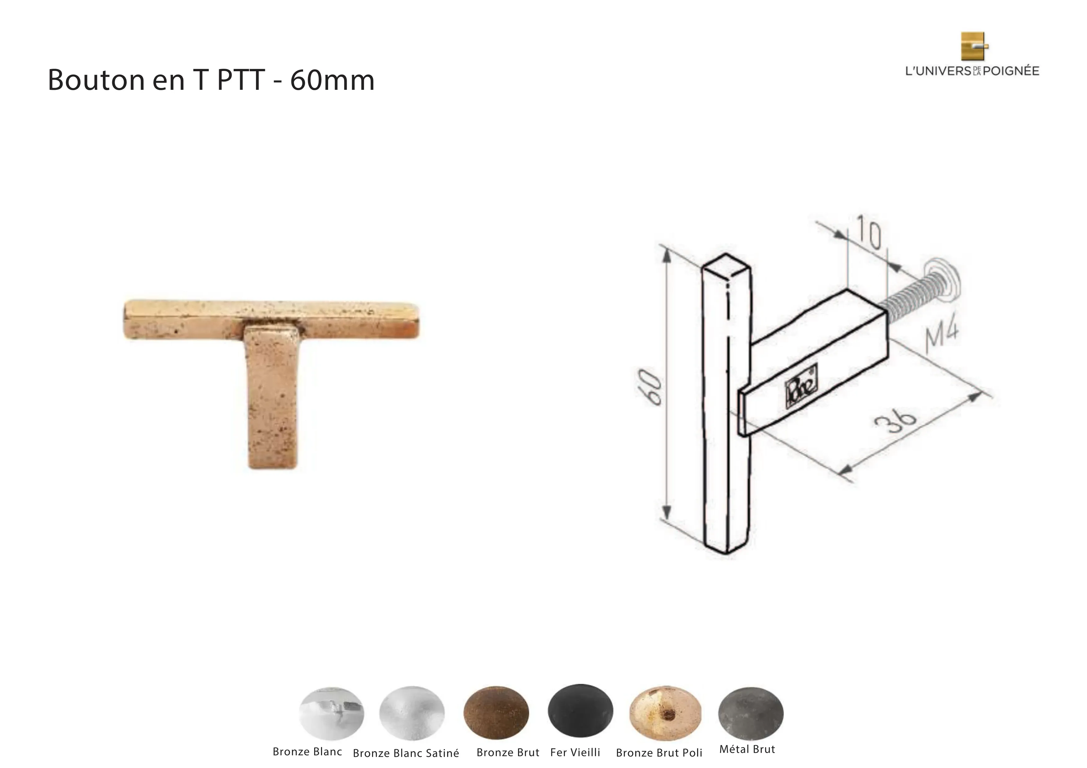 Le bouton de meuble PTT - 60 mm est inspiré du modèle de poignées Chemin de Fer, mais revisitée dans une version géométrique audacieuse. Son design unique donne l’illusion d’une barrette flottant délicatement sur son pied, offrant une esthétique légère et sophistiquée. Alliant minimalisme et caractère, ce bouton en T s’intègre aussi bien dans des intérieurs contemporains qu’industriels.