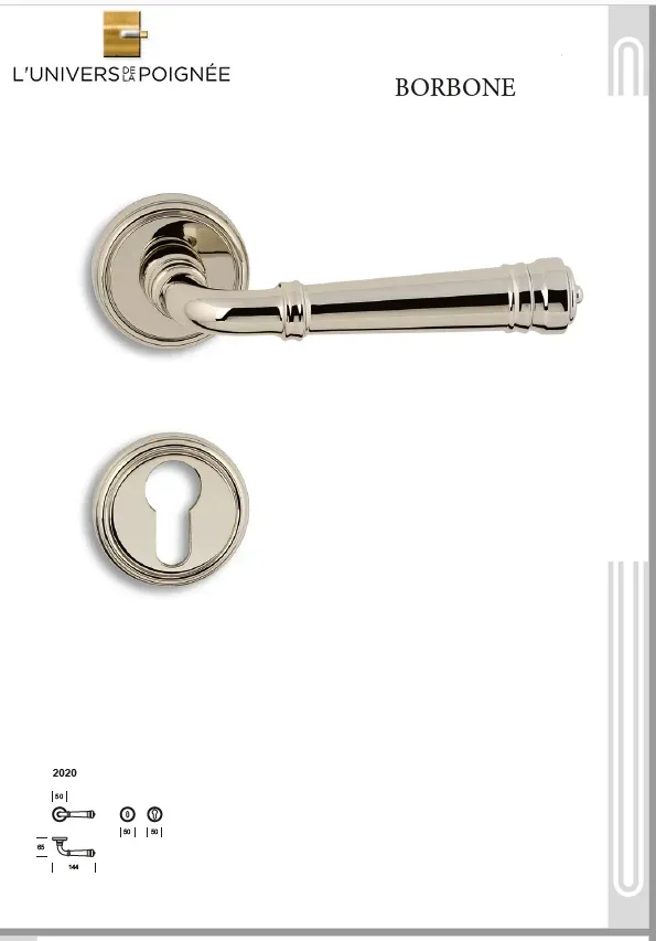 La poignée de porte Borbone s’inspire de l’esthétique des grandes demeures du XXe siècle pour proposer un design classique et intemporel. Son barreau long et raffiné, aux lignes équilibrées, exprime une élégance sobre et maîtrisée, adaptée à une grande variété d’intérieurs, traditionnels ou contemporains.